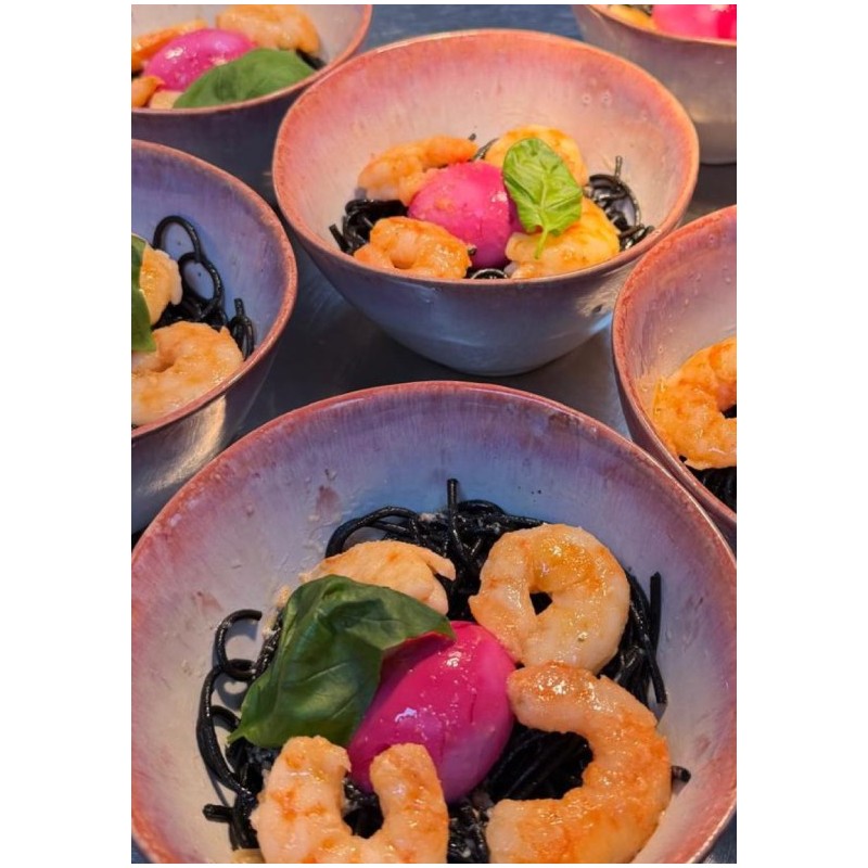 Langostinos confitados sobre cama de spaghetti al nero di sepia al ajillo.